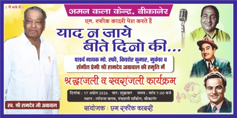 बीकानेर,17 अप्रैल को लायंस क्लब पंचशती सर्किल शाम 7 बजे संगीत कला प्रेमी रामदेव...