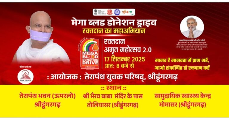 बीकानेर,श्रीडूंगरगढ़,कल दिनांक 17 सितंबर 2025 को तेरापंथ युवक परिषद्,श्रीडूंगरगढ़ द्वारा मेगा ब्लड डोनेशन ड्राइव...
