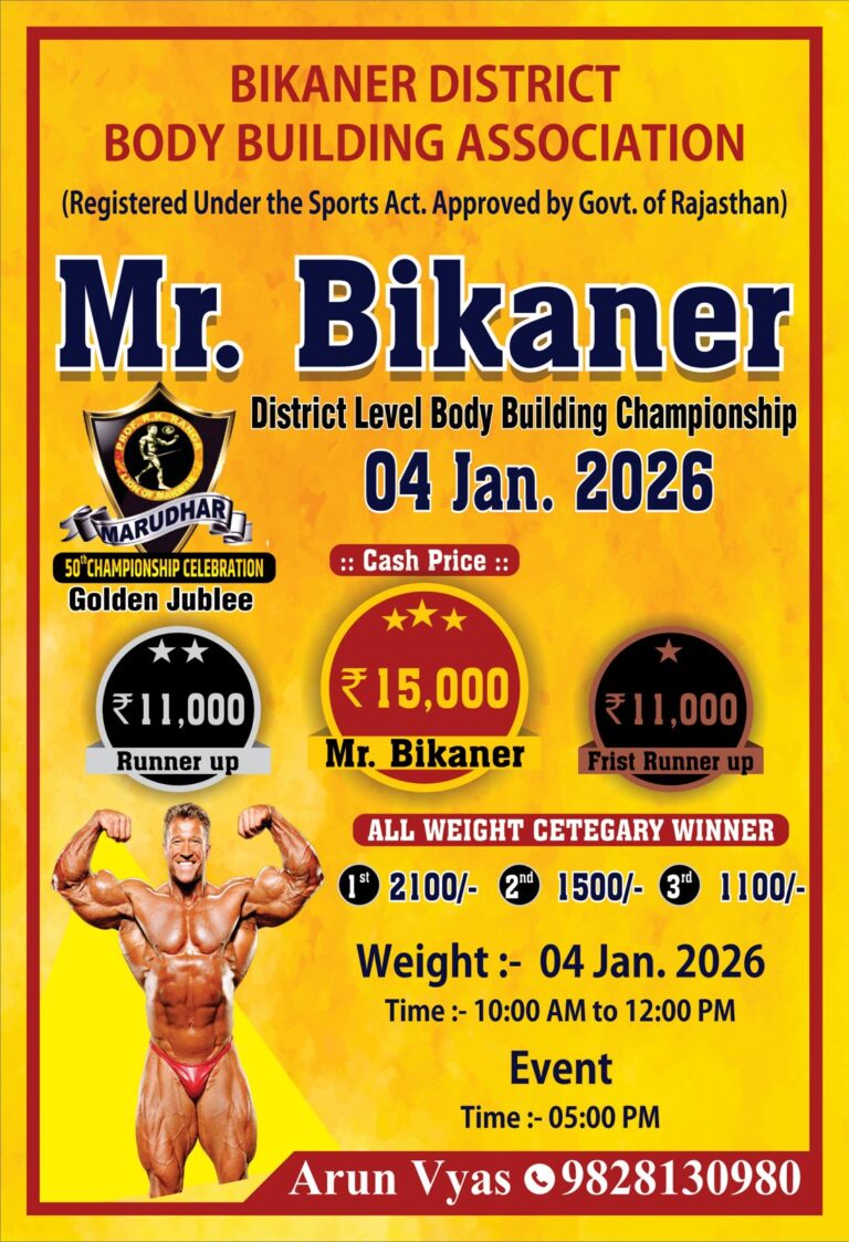बीकानेर,जिला बॉडी बिल्डिंग संगम और मरुधर जिम्नेजियम के सयुंक्त तत्वाधान में जिला स्तरीय बॉडी...
