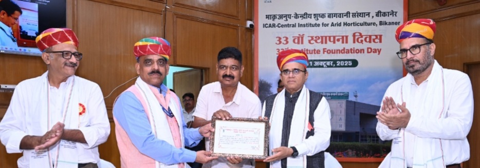 बीकानेर,भा.कृ.अनु.प. केन्द्रीय शुष्क बागवानी संस्थान का 33वां स्थापना दिवस 01.10.2025 को आयोजित किया गया। इस सुअवसर पर संस्थान के निदेशक डॉ. जगदीश राणे ने उपस्थित सभी गणमान्य अतिथियों का स्वागत करते हुए संस्थान की प्रगति एवं संस्थान द्वारा विकसित विभिन्न सब्जी एवं फल फसलों की किस्मों के बारे में जानकारी दी। इस समारोह के मुख्य अतिथि प्रोफेसर मनोज दीक्षित, कुलगुरू, महाराजा गंगा सिंह विश्वविद्यालय, बीकानेर ने केशबास के द्वारा बागवानी के क्षेत्र में विकसित की जा रही तकनीकियों व कृषक जो इनसे लाभ उठाकर रेगिस्तान की विपरीत परिस्थितियों में भी अच्छी आय प्राप्त कर रहें हैं उनकी सराहना की। उन्होंने वैज्ञानिकों व कृषकों का आह्वान करते हुए कहा कि भारत के 2047 के लक्ष्य जिसमें भारत को विकसित राष्ट्र के रूप में विकसित करने के लक्ष्य को रखते हुए त्वरित गति से कृषि एवं बागवानी के विकास की आवश्यकता पर जोर दिया। उन्होंने कहा कि भारत में कृषि एवं बागवानी सांस्कृतिक, आध्यात्मिक व पर्यावरण के साथ समावित है और यहां पौधों को जैसे तुलसी. बेल, खेजड़ी आदि को बहुत ही पवित्र भाव से देखा जाता है कार्यक्रम के दौरान राष्ट्रीय उष्ट्र अनुसंधान संस्थान, बीकानेर के निदेशक, डॉ. अनिल कुमार पूनियां ने कहा कि बागवानी के अनुसंधानों की वजह से आज फल व सब्जियों की आवक तेजी से बढ़ी है। ऐसे में कृषकों को इनकी मूल्य संवर्द्धन तकनीक एवं विपणन प्रबंधन पर विशेष ध्यान देने की आवश्यकता है।