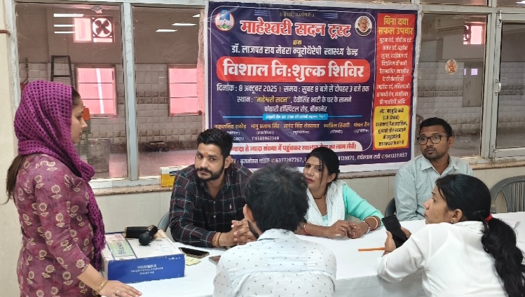 बीकानेर,माहेश्वरी सदन ट्रस्ट और डॉ लाजपत राय मेहरा न्यूरोथेरेपी स्वास्थ्य केंद्र के संयुक्त तत्वाधान में विशाल निशुल्क थिरैपी शिविर का आयोजन आज दिनांक 8 अक्टूबर बुधवार को माहेश्वरी सदन,देवी सिंह भाटी के घर के सामने कोठारी रोड़ पर आयोजित हुआ।