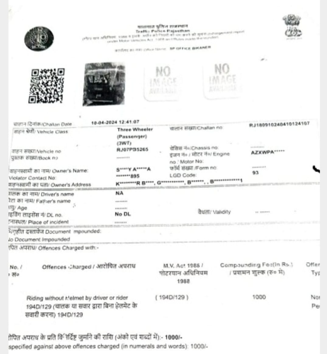 बीकानेर,बीकानेर में ट्रैफिक पुलिस का एक अनोखा चालान सोशल मीडिया पर चर्चा का विषय बन गया है।शहर में एक थ्री व्हीलर ऑटो टैक्सी (RJ07PB5262) पर बिना हेलमेट वाहन चलाने का चालान काट दिया गया।यह चालान 10 अप्रैल 2024 को सब-इंस्पेक्टर अनिल कुमार द्वारा जारी किया गया था। चालान में साफ लिखा है।“चालक या सवार द्वारा बिना हेलमेट के वाहन चलाया गया।”इस आधार पर पुलिस ने 1000 रुपए का जुर्माना लगा दिया।मामला तब सामने आया जब ऑटो चालक संजय आचार्य ने वाहन को बेचने से पहले चालान की स्थिति जांचनी चाही। ऑनलाइन रिकॉर्ड देखने पर वह दंग रह गया। थ्री व्हीलर ऑटो पर हेलमेट न पहनने का चालान दर्ज था! ऑटो चालक ने हैरानी जताते हुए कहा “ऑटो चलाने वाले के लिए हेलमेट पहनने का कोई नियम नहीं है, फिर ये चालान कैसे बन गया?”घटना के बाद यह मामला सोशल मीडिया पर तेजी से वायरल हो गया है। लोग पुलिस की कार्यशैली पर सवाल उठा रहे हैं और मजाकिया अंदाज़ में कह रहे हैं “अब ऑटो ड्राइवर भी हेलमेट पहनकर सवारी उठाएंगे क्या?”