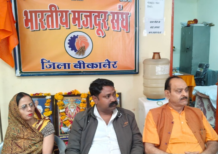 बीकानेर,भारतीय मजदूर संघ, बीकानेर की जिला कार्यसमिति बैठक संघ कार्यालय, बीकानेर में दोपहर 1:30 बजे आयोजित की गई। बैठक की अध्यक्षता प्रदेश उपाध्यक्ष गौरीशंकर व्यास (पूर्णकालिक) एवं रेखा पंडित ने की तथा मंच संचालन जिला मंत्री नवीन स्वामी द्वारा किया गया। बैठक में पुरी, उड़ीसा में आयोजित राष्ट्रीय अधिवेशन में पारित प्रस्तावों पर विस्तृत चर्चा की गई। प्रदेश उपाध्यक्ष गौरीशंकर व्यास ने अधिवेशन में पारित 5 प्रमुख प्रस्तावों की जानकारी दी, जिनमें— श्रम कानूनों का बिना किसी अपवाद के सभी श्रमिकों पर सार्वभौमिक रूप से लागू किया जाना। ठेका श्रमिकों के शोषण को समाप्त करने हेतु कानून में संशोधन। आंगनबाड़ी कर्मियों को कर्मचारी घोषित कर वेतन एवं सामाजिक सुरक्षा का लाभ प्रदान करना। श्रमिक हितों की रक्षा एवं सामाजिक सुरक्षा के दायरे का विस्तार। जनरल भर्ती पर लगी रोक को तत्काल हटाना। बैठक में निर्णय लिया गया कि दिनांक 25 फरवरी 2026 को कलेक्टर, बीकानेर।के माध्यम से मुख्यमंत्री को श्रम विरोधी कानूनों एवं बजट घोषणा के विरोध में ज्ञापन प्रेषित किया जाएगा। इस अवसर पर दोपहर 3:00 बजे गंगा थिएटर से कलेक्टर कार्यालय तक रैली निकालकर प्रदर्शन किया जाएगा। सभी इकाइयों ने प्रदर्शन में बढ़-चढ़कर भाग लेने का संकल्प लिया।