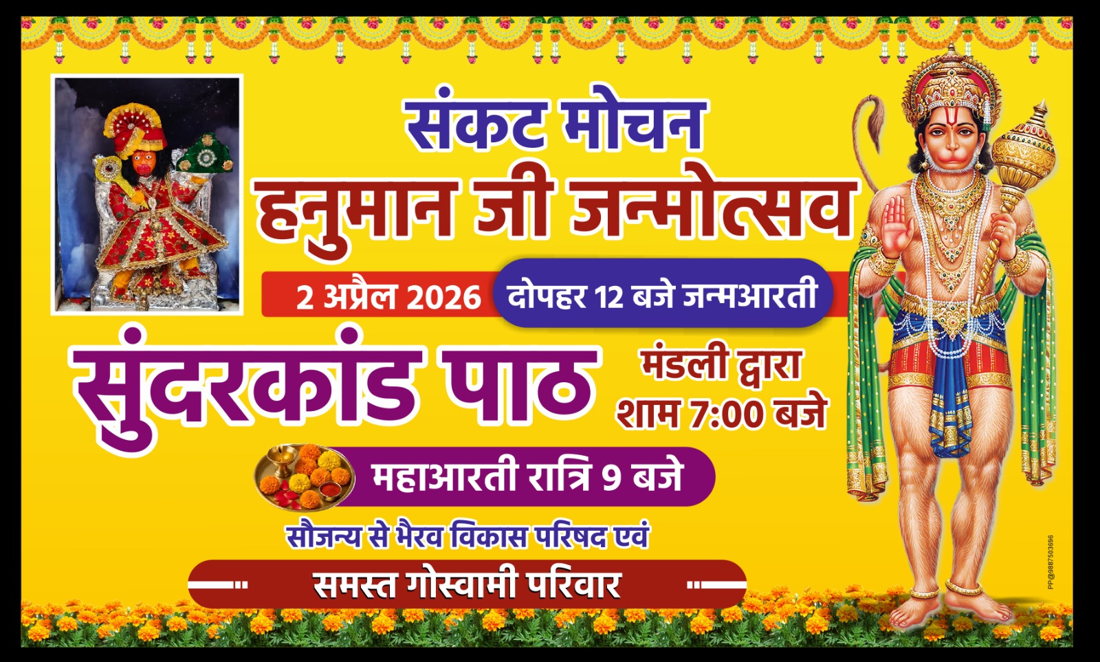 बीकानेर,गोस्वामी चौक स्थित चमत्कारी संकट मोचन हनुमान जी मंदिर में 2 अप्रैल को हनुमान जन्मोत्सव बड़े धूमधाम से मनाया जाएगा। इस अवसर पर मंदिर में विभिन्न धार्मिक कार्यक्रमों का आयोजन किया जाएगा, जिसकी तैयारियां अंतिम चरण में पहुंच चुकी हैं। मंदिर परिसर में रंग-रोगन और सजावट का कार्य जोर-शोर से चल रहा है, जिससे पूरे क्षेत्र में उत्सव का माहौल बना हुआ है। आयोजन समिति से जुड़े अभिमन्यु गोस्वामी ने बताया कि दोपहर 12 बजे भगवान हनुमान की आरती होगी, वहीं शाम 7 बजे सुंदरकांड पाठ मंडली द्वारा सामूहिक सुंदरकांड पाठ किया जाएगा। इसके बाद रात्रि 9 बजे महाआरती का आयोजन किया जाएगा।मंदिर समिति ने सभी श्रद्धालुओं से अधिक से अधिक संख्या में पहुंचकर सुंदरकांड पाठ और दर्शन का लाभ लेने का आग्रह किया है। हनुमान जन्मोत्सव को लेकर श्रद्धालुओं में विशेष उत्साह देखने को मिल रहा है।