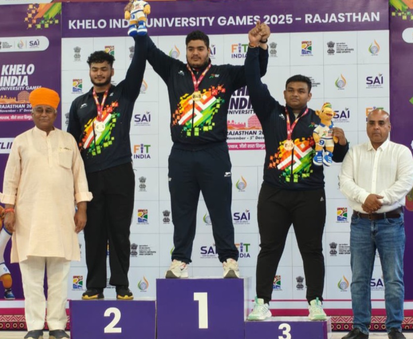 बीकानेर, खेलो इंडिया यूनिवर्सिटी गेम्स के पांचवें और वेटलिफ्टिंग प्रतियोगिता के अंतिम दिन शनिवार को महाराजा गंगासिंह विश्वविद्यालय के वेटलिफ्टर केशव बिस्सा ने 110 किलोग्राम भारवर्ग के मुकाबलों में स्वर्ण पदक जीतकर इतिहास रच दिया। विश्वविद्यालय परिसर में आयोजित पुरस्कार वितरण समारोह में बीकानेर पश्चिम विधायक जेठानंद व्यास ने बिस्सा को गोल्ड मेडल प्रदान किया तो स्टेडियम तालियों से गूंज उठा।