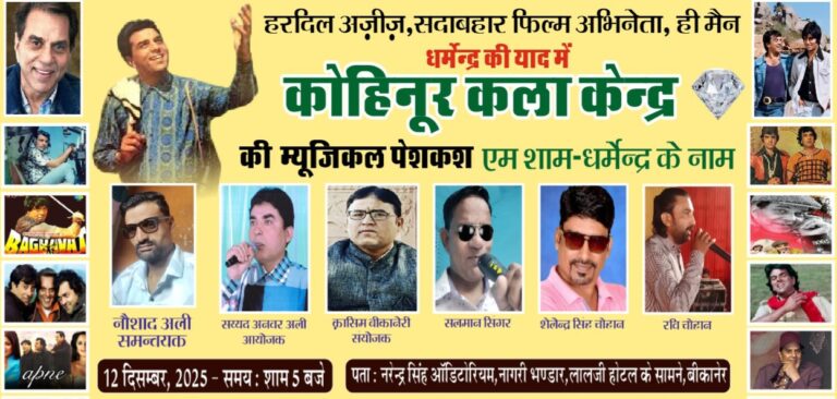 बीकानेर,हिंदी सिनेमा के सदाबहार अभिनेता, पद्मभूषण से सम्मानित, बीकानेर के पूर्व सांसद हीमैन धर्मेंद्र...