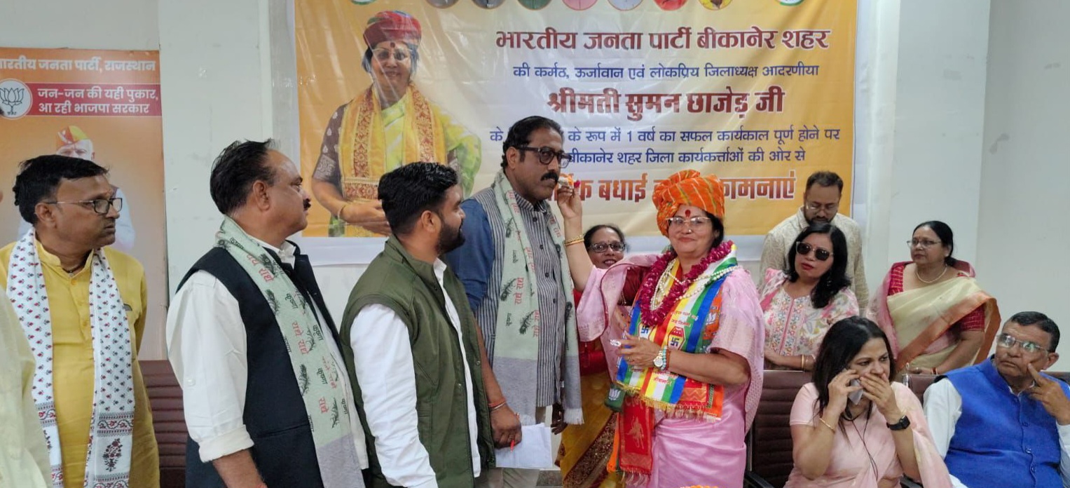 बीकानेर,भारतीय जनता पार्टी के बीकानेर संभाग कार्यालय में बीकानेर शहर जिला अध्यक्ष सुमन छाजेड़ के एक वर्ष के सफलतम कार्यकाल के उपलक्ष में चंग पर धमाल कार्यक्रम का आयोजन किया गया। कार्यक्रम में उत्साहपूर्ण माहौल रहा तथा पदाधिकारियों और कार्यकर्ताओं ने जिलाध्यक्ष को बधाई एवं शुभकामनाएं दीं।