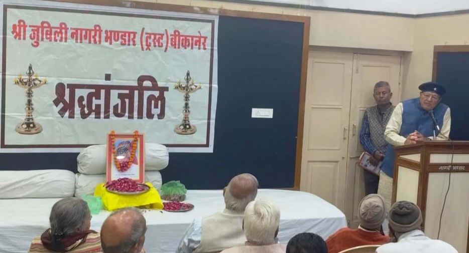 बीकानेर,देश के ख्यातनाम कवि, संपादक, चिंतक एवं आलोचक कीर्तिशेष भवानी शंकर व्यास ‘विनोद’ का गत दिनों असामयिक निधन होने पर उन्हें नमन करने हेतु उनकी स्मृति में श्रद्धांजलि एवं पुष्पांजलि कार्यक्रम का आयोजन श्री जुबिली नागरी भण्डार (ट्रस्ट) एवं श्री जुबिली नागरी भण्डार पाठक मंच के संयुक्त तत्वावधान में स्थानीय नागरी भण्डार स्थित महारानी सुदर्शन आर्ट गैलरी में रखा गया ।