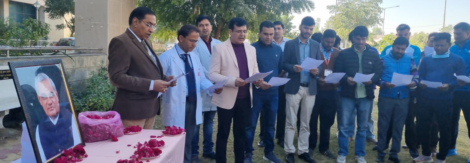 बीकानेर,भारत के पूर्व प्रधानमंत्री एवं भारत रत्न स्वर्गीय अटल बिहारी वाजपेयी की जयंती के अवसर पर गुरुवार को सुशासन दिवस मनाया गया. इस दौरान सुपर स्पेशलिटी अस्पताल (एसएसबी) के प्रांगण में आयोजित कार्यक्रम में स्व. वाजपेयी के चित्र पर पुष्पांजलि अर्पित की गई तथाएसपी मेडिकल कॉलेज प्राचार्य डॉ. सुरेंद्र कुमार, पीबीएम अधीक्षक डॉ. बीसी घीया एवं एसएसबी अधीक्षक डॉ. संजीव बुरी ने डॉक्टर्स, नर्सिंग ऑफिसर्स तथा अन्य स्टाफ को सुशासन शपथ दिलाई. जिसमें सत्यनिष्ठा, पारदर्शिता, त्वरित निस्तारण और नवाचार के माध्यम से बेहतर लोकसेवा प्रदान करने का संकल्प लिया गया। शपथ मे एसपी मेडिकल कॉलेज से सम्बद्ध पीबीएम अस्पताल, एसएसबी अस्पताल आदि के कार्मिक एवं अधिकारी उपस्थित रहे.