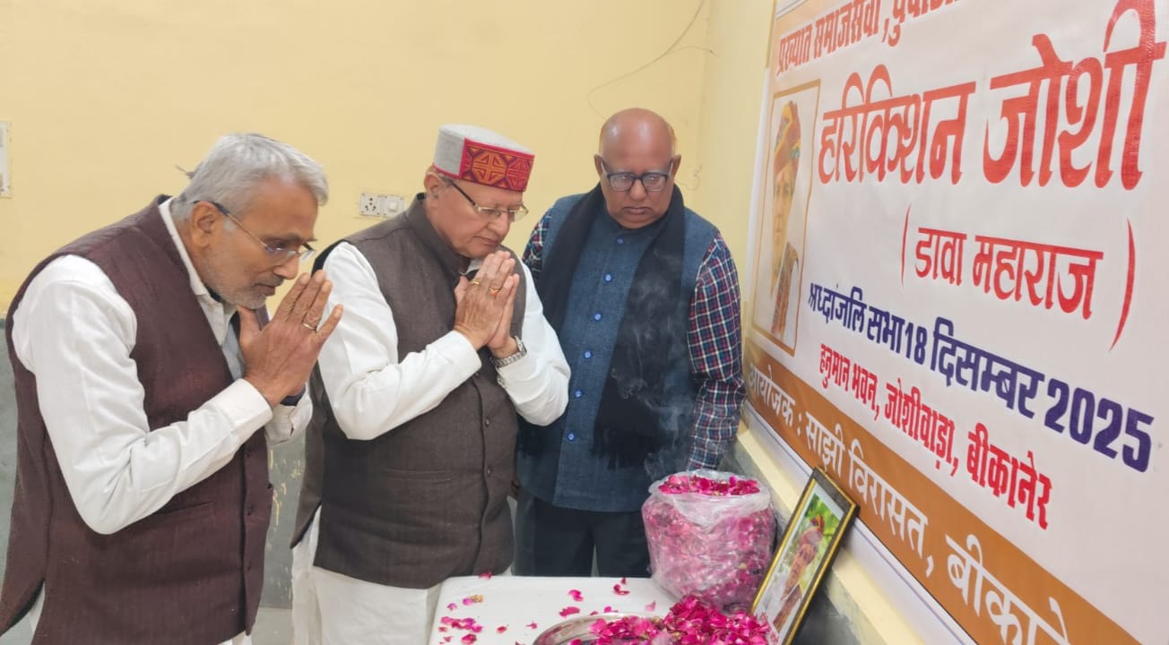 बीकानेरी/ साझी विरासत, बीकानेर के तत्वावधान में ख्यातनाम समाजसेवी एवं युवाओं के प्रेरणास्रोत हरिकिशन जोशी (डावा महाराज) के असामयिक निधन पर भावभीनी श्रद्धांजलि सभा का आयोजन गुरुवार को किया गया।जोशीवाड़ा स्थित हनुमान भवन में आयोजित श्रद्धांजली सभा में नगर के अनेक गणमान्य महानुभावों ने हरिकिशन जोशी (डावा महाराज) के तेल चित्र पर पुष्प अर्पित किए।