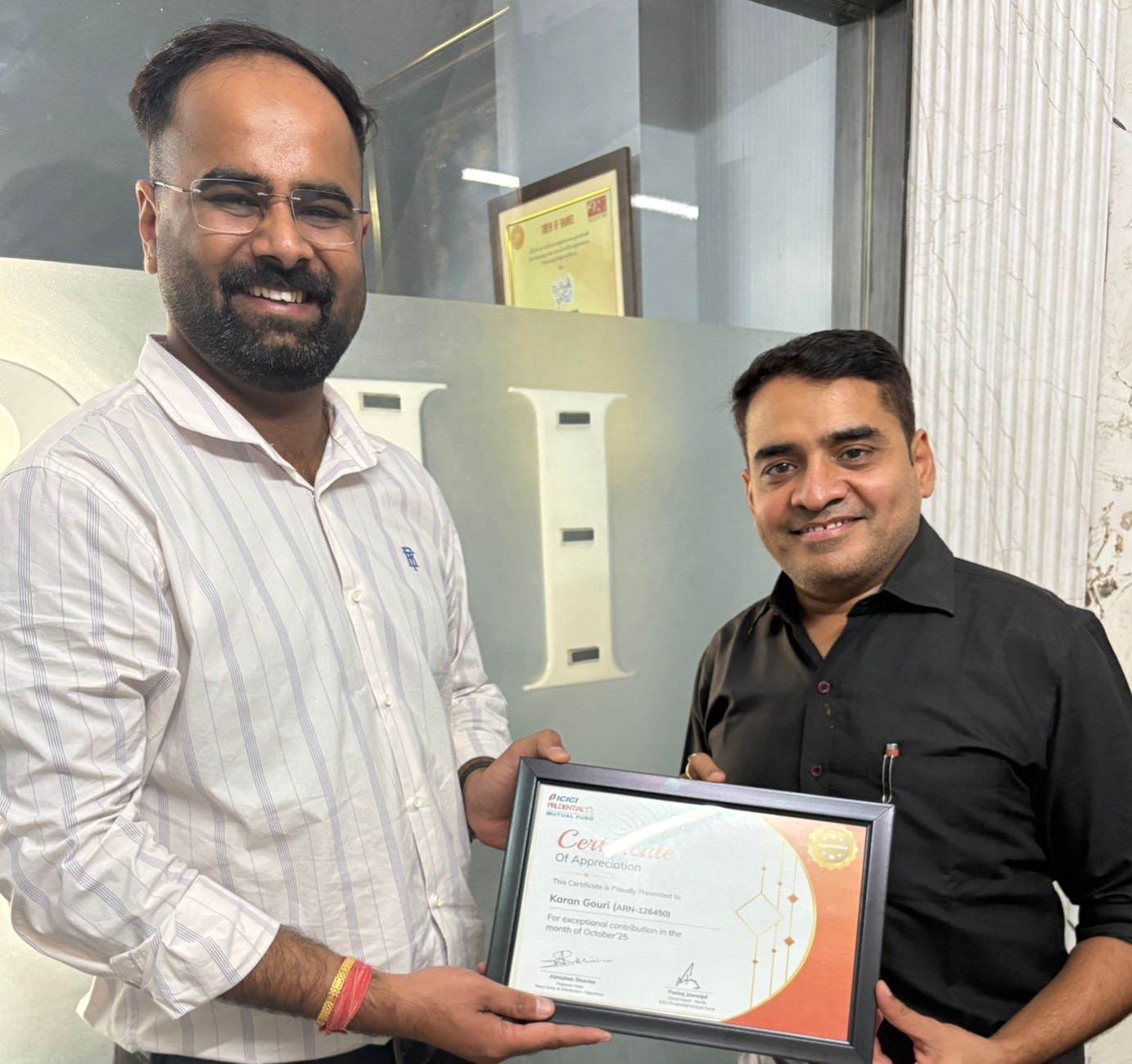 बीकानेर,आईसीआईसीआई प्रूडेंशियल म्यूचुअल फंड की बीकानेर शाखा ने वर्ल्ड इन्वेस्टर वीक 2025 के तहत बीकानेर के वित्तीय सलाहकार करन गौरी, एम.डी., इंटेग्रिटी फाइनेंशियल सर्विसेज, जेएनवी कॉलोनी को सम्मानित किया। करन गौरी ने अक्टूबर माह में एकल निवेशक से 5 लाख की एसआईपी और 5 करोड़ के एक मुश्त निवेश का व्यवसाय प्राप्त कर उल्लेखनीय योगदान दिया। वित्तीय जागरूकता बढ़ाने के उद्देश्य से आईसीआईसीआई प्रूडेंशियल म्यूचुअल फंड के शाखा प्रबंधक हर्षवर्धन आचार्य ने करन गौरी को प्रमाण पत्र देकर सम्मानित किया और उन्हें बधाई दी। इस अवसर पर इंटेग्रिटी फाइनेंशियल सर्विसेज की टीम से वाइस प्रेसिडेंट लोकेश गहलोत और रिलेशनशिप मैनेजर अमित कुमार भी उपस्थित रहे।