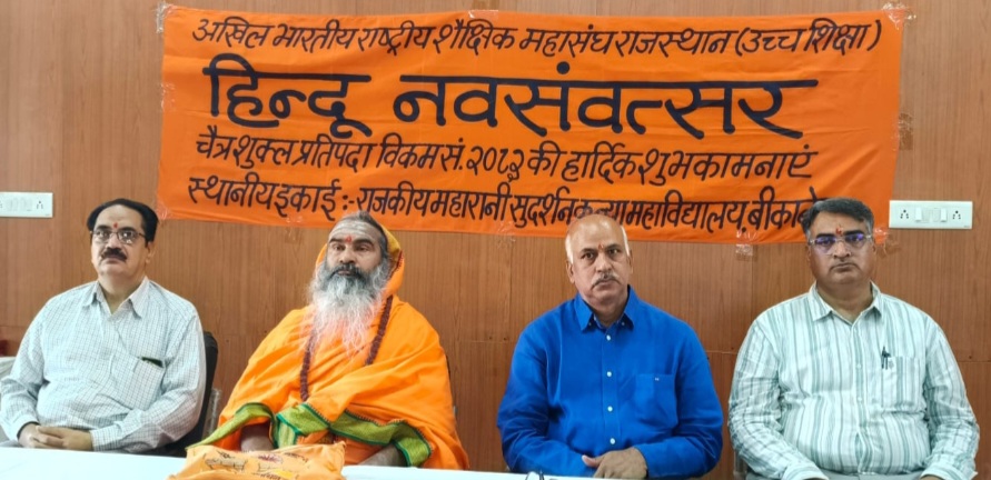 बीकानेर,अखिल भारतीय राष्ट्रीय शैक्षिक महासंघ राजस्थान उच्च शिक्षा की स्थानीय इकाई महारानी सुदर्शन कन्या महाविद्यालय द्वारा आज नवसंवत्सर कार्यक्रम का आयोजन किया गया। इस अवसर पर मुख्य अतिथि एवं मुख्य वक्ता स्वामी विमर्शानंद गिरि महाराज, अधिष्ठाता, शिवबाड़ी मठ, ने अपने मुख्य उद्बोधन में कहा कि अभी मधुमास है वसंत ऋतु है, बसंत का मतलब यह है कि हर पत्ता आपसे बात करना चाहता है हर पुष्प आपको सुवासित करता है, ऐसे उल्लास और आनंदमय वातावरण में, हम निरंतर चिंतन करते रहे,प्रत्येक भारतीय बिटिया, प्रत्येक भारतीय शेरनी की तीसरी आंख खुल जानी चाहिए। जब हम स्वयं इतने पवित्र होंगे, हम स्वयं इतने चरित्रवान होंगे, स्वयं इतने दृढ़ होंगे, स्वयं सत्य के पथ पर चलने वाले होंगे, स्वयं न्याय के पथ पर चलने वाले होंगे,स्वयं आलोक के पथ पर चलते हुए माता पिता की, टीचर्स की बात मानेंगे, तब यह तीसरा नेत्र खुल सकता है। यह हमारी विशेषता है कि हम उस परम तत्त्व से जुड़े हुए हैं जो काल से परे था, क्योंकि महाकाल की पूजा करते हैं हम काल की पूजा करें। हमारी पूजा से, हमारे संकल्प से जो संकल्प से कहते हैं, जहाँ पर ध्रुव संकल्प है, संकल्प ध्रुव, संकल्प दृढ़, संकल्प जैसे नचिकेता ने किया था, जैसे ध्रुव ने किया था और अंगद ने किया था, चिंतन करने की आवश्यकता है। हम भगवान राम को मानते हैं भगवान राम के मंदिर में जाते हैं अंगद कितने युवा बनके हमारी परंपरा को गौरवान्वित कर रहे हैं, यदि युवा यह कहे कि मैं अंगद हूँ, मैं नचिकेता हूँ, तो हम संवत्सर की बात कर रहे हैं तो हम अपने आप को 2 अरब वर्ष पूर्व लेके जा रहे हैं इसका मतलब हमको गर्व होना चाहिए। गर्व से कहो हम भारतीय हैं। गर्व से कहो कि आप भारतीय बिटिया हो। गर्व से कहो भारतीय बहन हो, जब सुबह उठने से लेकर रात्रि तक मेरी सारी दिनचर्या भारत से, भारतीयता से भरी हुई होगी, तभी कालक्रम के विकास को और नव संवत्सर के महत्व को समझ पाएंगे।