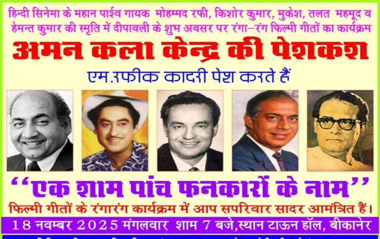 बीकानेर,आगामी 18 नवम्बर को टाउन हॉल में शाम 6 30 बजे हिन्दी सिनेमा के...