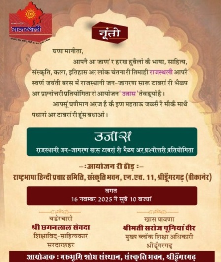 समारोह संयोजक साहित्यकार रवि पुरोहित ने बताया कि नई पीढ़ी को भाषा के संस्कारों से शिक्षित, संस्कारित और परिचित करवाने के लिए 16 नवम्बर 25 रविवार को राष्ट्रभाषा हिन्दी प्रचार समिति के प्रांगण में प्रातः 10 बजे राजस्थानी कहानी प्रश्नोत्तरी के कार्यक्रम उजास का आयोजन शिक्षाविद् साहित्यकार छगनलाल सेवदा की अध्यक्षता और मुख्य ब्लॉक शिक्षा अधिकारी, श्रीडूंगरगढ़ सरोज पूनिया वीर के मुख्य आतिथ्य में बागेश्वरी साहित्य, कला, सांस्कृतिक विरासत संस्थान के सहयोग से किया जायेगा। समन्वयक कवयित्री भगवती पारीक ने बताया कि प्रश्नोतरी कार्यक्रम में प्रथम, द्वितीय और तृतीय स्थान पर रहने वाले विद्यार्थियों को 1100, 700 और 500 रुपए के नगद पारितोषिक के साथ पुरस्कृत किया जाएगा। पांच विद्यार्थियों को सान्त्वना पुरस्कार भी दिये जायेंगे। समारोह प्रबंधक सरोज शर्मा ने बताया कि उजास आयोजन में बच्चों द्वारा अपनी विभिन्न प्रतिभाओं यथा नृत्य, गायन, एकाभिनय, कविता पाठ आदि भी प्रस्तुत किये जायेंगे।