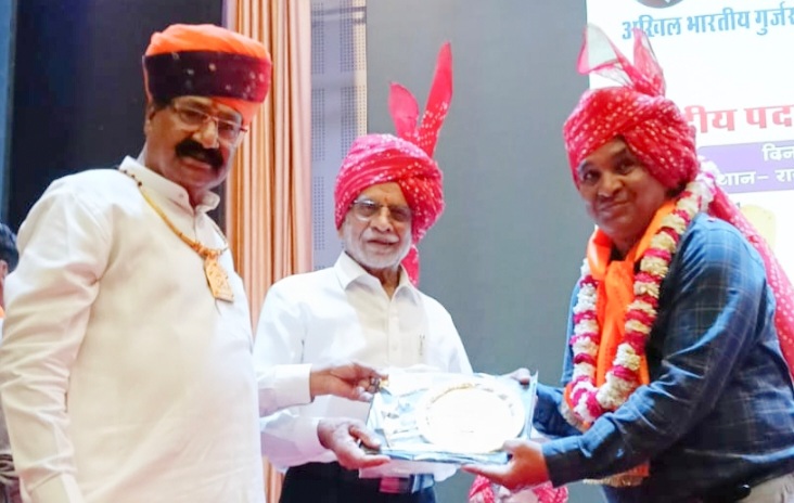 बीकानेर,अखिल भारतीय गुर्जर महासभा एवं राजस्थान गुर्जर महासभा के तत्वावधान में रविवार को राज्य स्तरीय महासम्मेलन का आयोजन कृषि अनुसंधान केन्द्र ऑडिटोरियम, दुर्गापुरा जयपुर में अखिल भारतीय गुर्जर महासभा के राष्ट्रीय कोर्डिनेटर देवकीनंदन काका के करकमलों द्वारा अखिल भारतीय गुर्जर महासंघ के राष्ट्रीय अध्यक्ष रवि शंकर धाभाई जो कि दो बार वर्ष 1984 महामहिम राष्ट्रपति ज्ञानी जैल सिंह व वर्ष 1989 में आर वेंकटरमन से प्रेसिडेंट स्काउट एव प्रेसिडेंट रोवर, एव भारत सरकार के राष्ट्रीय युवा पुरस्कार व राष्ट्रीय सड़क सुरक्षा पुरस्कार से सम्मानित जयपुर के वरिष्ठ सामाजिक कार्यकर्ता अभिनंदन किया गया।