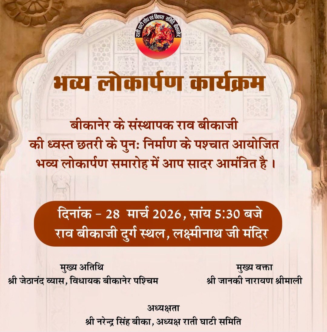 समिति के महामंत्री ओम नारायण श्रीमाली ने बताया इस भव्य आयोजन का आगाज दिनांक 28 मार्च 2026, शनिवार को 5:30 बजे राव बीकाजी दुर्गास्थल, लक्ष्मीनाथ जी का मंदिर बीकानेर में किया जाएगा । इस भव्य समारोह में मुख्य अतिथि जेठानंद व्यास, विधायक पश्चिम, कार्यक्रम के अध्यक्ष नरेंद्र सिंह बीका एवं मुख्य वक्ता के रूप में जानकी नारायण श्रीमाली शिरकत करेंगे । इस समारोह में बीकानेर के समस्त प्रबुद्ध जनों को आमंत्रित किया गया है । प्रदीप सिंह चौहान, उपाध्यक्ष, राती घाटी शोध एवं विकास समिति बीकानेर ।