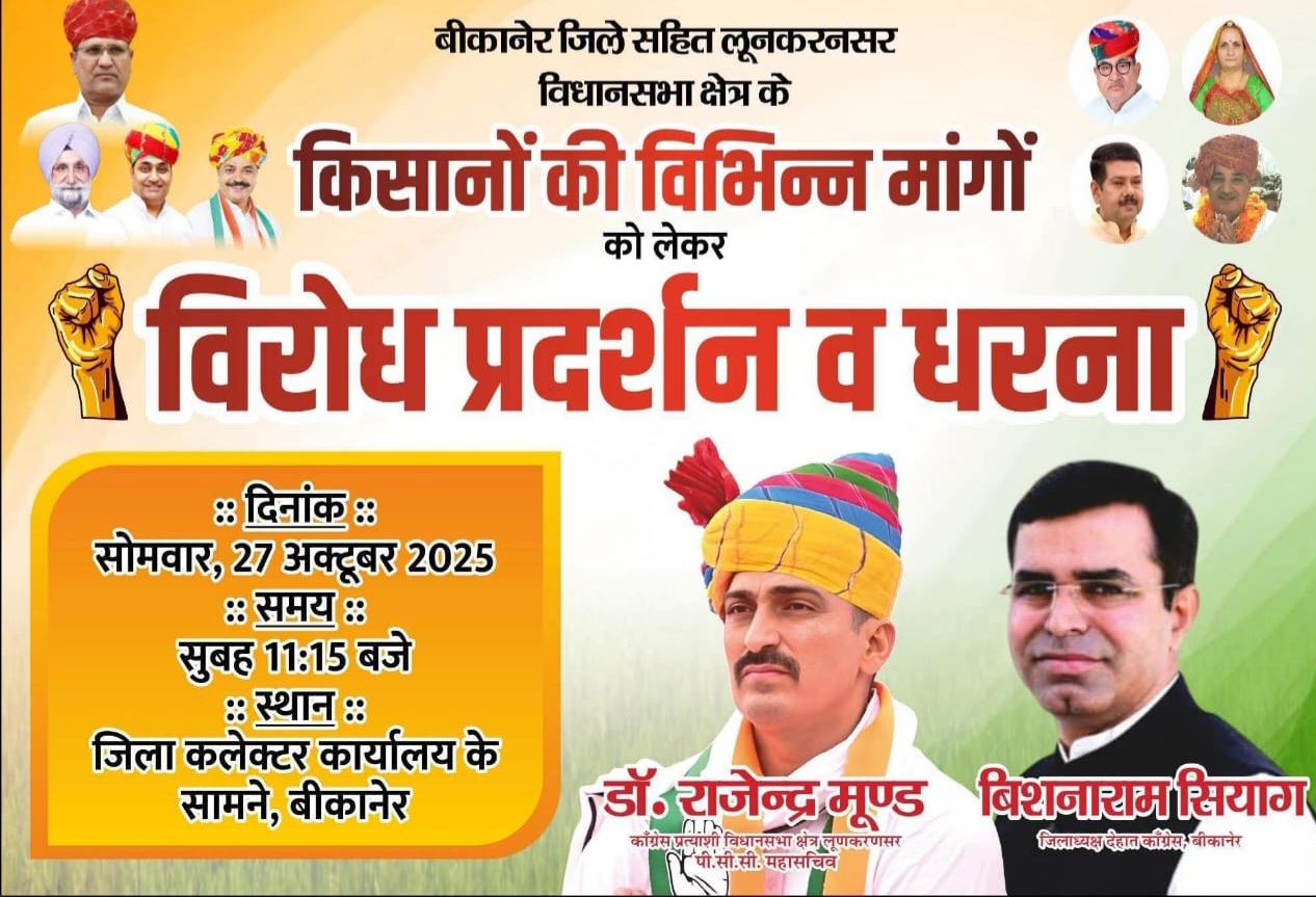 बीकानेर, मूंगफली तुलाई में घोटाले,फर्जी गिरदावरी, डीएपी खाद की कमी और किसानों की विभिन्न समस्याओं को लेकर जिला कांग्रेस कमेटी अध्यक्ष बिशनाराम सियाग और लूणकरनसर विधानसभा प्रत्याशी डॉ राजेन्द्र मूण्ड के संयुक्त नेतृत्व में किसान सोमवार को प्रातः 11:15 बजे से अपनी समस्याओं को लेकर जिला कलेक्ट्रेट पर प्रदर्शन करेंगे।