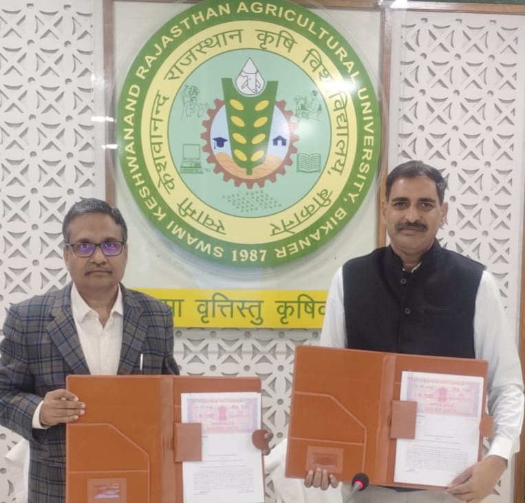बीकानेर,कृषि क्षेत्र में शोध, अनुसंधान, शिक्षा और तकनीक हस्तांतरण के लिए स्वामी केशवानंद राजस्थान कृषि विश्वविद्यालय अब केन्द्रीय शुष्क क्षेत्र अनुसंधान संस्थान (काजरी), जोधपुर के साथ मिलकर कार्य करेगा। दोनों संस्थानों के मध्य इस संबंध में एमओयू हस्ताक्षर किया गया है। विश्वविद्यालय के कुलगुरु डॉ अखिल रंजन गर्ग तथा निदेशक काजरी डॉ एसपीएस तंवर की मौजूदगी में मंगलवार को इस एमओयू पर हस्ताक्षर किये गए। इस अवसर पर कुलगुरु डॉ अखिल रंजन गर्ग ने कहा कि किसानों और विद्यार्थियों के हित में यह समझौता मील का पत्थर साबित होगा। राष्ट्रीय शिक्षा नीति 2020 के अनुरूप कार्य करने के लिए इससे दोनों संस्थान लाभान्वित होंगे। एमओयू के माध्यम से दोनों संस्थानों में उपलब्ध संसाधनों का कुशलतम उपयोग करते हुए वर्तमान में खेती के समक्ष आ रही चुनौतियों से निपटने की दिशा में कार्य किया जा सकेगा। विश्वविद्यालय के डीन, डायरेक्टर्स तथा अन्य वैज्ञानिकों के साथ चर्चा करते हुए डॉ गर्ग ने कहा कि ड्रोन के उपयोग पर अधिक से अधिक कार्य किया जाए। कृत्रिम बुद्धिमत्ता के माध्यम से किसानों को मौसम संबंधी सूचना तथा बीमारी रोकथाम, उपचार आदि की जानकारी दी जाए। एक कॉमन रिसर्च प्रोग्राम के माध्यम से इस समझौते पर कार्य करते हुए किसानों को अधिकतम लाभ देना सुनिश्चित करें ।