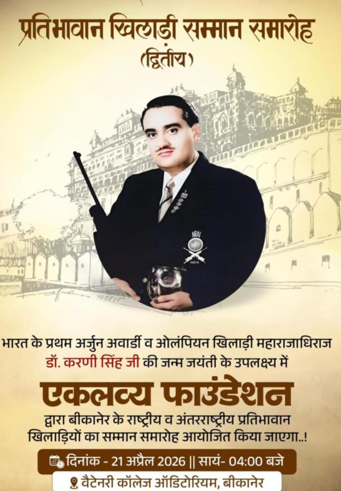 बीकानेर,राजस्थान एकलव्य फाउंडेशन द्वारा खेल जगत को प्रोत्साहित करने की दिशा में एक और सराहनीय कदम उठाया जा रहा है। यह इस श्रृंखला का दूसरा भव्य आयोजन होगा, जो 21 अप्रैल 2026 को शाम 4 बजे बीकानेर स्थित वेटेनरी कॉलेज ऑडिटोरियम में आयोजित किया जाएगा।