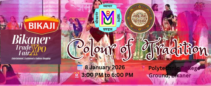 बीकानेर, बीकानेर उद्योग व्यापार मंडल द्वारा आयोजित बीकानेर ट्रेड फेयर एक्सपो में मनोरंजन और संस्कृति की श्रृंखला की शुरुआत गुरुवार 8 जनवरी को “कलर ऑफ़ राजस्थान” कार्यक्रम से होगी। लोकराग फाउंडेशन की ओर से आयोजित यह मंचीय आयोजन राजस्थानी परंपराओं, वेशभूषा, लोक-संगीत और सांस्कृतिक संवाद को एक साथ प्रस्तुत करेगा। कार्यक्रम दोपहर 3 बजे से सायं 6 बजे तक पालीटेक्निक कॉलेज ग्राउंड में होगा, जहां दर्शक और प्रतिभागी दोनों के लिए जीवंत अनुभव मिलेगा।