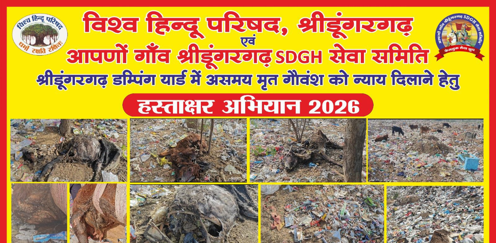 श्रीडूंगरगढ़,बीकानेर,आपणो गांव श्रीडूंगरगढ़ समिति के राज सुथार ने बताया कि विश्व हिन्दू परिषद श्रीडूंगरगढ़ एवं आपणो गाँव श्रीडूंगरगढ़ SDGH सेवा समिति के संयुक्त तत्वावधान में श्रीडूंगरगढ़ डम्पिंग यार्ड में असमय मृत गौवंश को न्याय दिलाने हेतु कल दिनांक 12/01/2026 को प्रातः 10 बजे एक हस्ताक्षर अभियान दो स्थानों पर होगा स्थान – मैन मार्केट टैक्सी स्टैंड एवं घूमचक्कर, श्रीडूंगरगढ़। सभी जागरूक नागरिकों सेठ निवेदन किया गया है अधिकाधिक संख्या में हस्ताक्षर अभियान के सहयोगी बने।