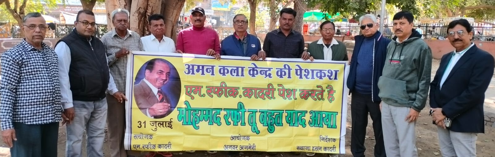 बीकानेर,अमन कला केंद्र द्वारा 23 दिसंबर को शाम 6 बजे टाउन हॉल में पार्श्वगायक मो रफी के 101 वें जन्मदिन जयंती की पूर्व संध्या पर प्रस्तावित कार्यक्रम मो रफी तू बहुत याद आया के फ्लैस बैनर का विमोचन रतन बिहारी पार्क में किया गया संस्था अध्यक्ष एम रफीक कादरी ने बताया कि इस अवसर पर समाजसेवी एन डी रंगा अयूब अली सोढा अहमद हारून कादरी एम रफीक कादरी डॉ भूपेंद्र तिवाड़ी मो सदीक चौहान सिराजुद्दीन खोखर महबूब रंगरेज विजय सिंह शेखावत मदन खत्री कृपाल चंद उपस्थित थे