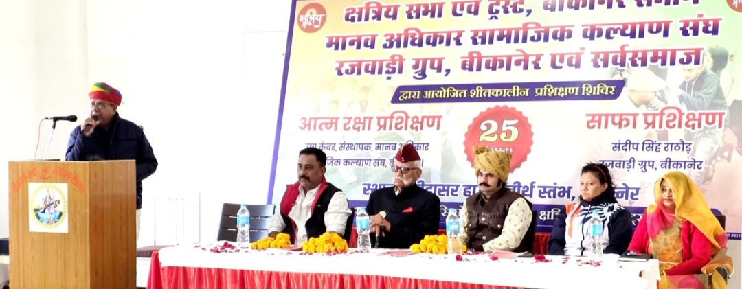 बीकानेर,आज के समय में महिलाओं और बच्चियों को आत्मरक्षा की बहुत आवश्यकता है, क्योंकि जब तक बच्चियों आत्मरक्षा के क्षेत्र में परांगत नहीं होंगी, तब तक उनको घर बाहर निकलने में संकोच रहेगा एवं हमारी राजस्थान की पारंपरिक वेशभुषा साफा भी हरेक बांधना आना चाहिए हमारी धरोहर सम्मान का प्रतीक है । यह उद्गार आज क्षत्रिय सभा एवं ट्रस्ट बीकानेर संभाग द्वारा आयोजित रजवाड़ी ग्रुप एवं मानव अधिकार सामाजिक कल्याण संघ द्वारा संचालित आत्म रक्षा एवं साफा प्रशिक्षण शिविर के शुभारंभ के अवसर पर गौरव सेनानी एसोसिएशन बीकाणा के अध्यक्ष कर्नल हेम सिंह शेखावत ने व्यक्त किये ।