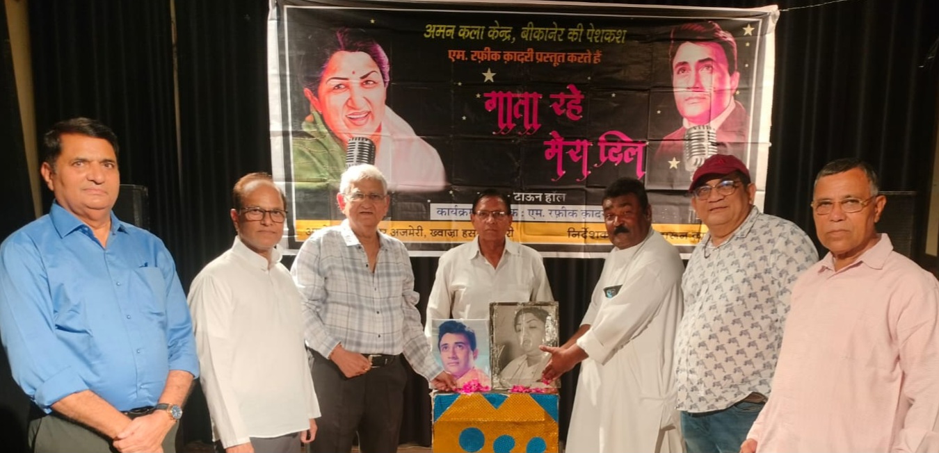 बीकानेर,गाता रहे मेरा दिल में गूंजे तराने अमन कला केंद्र द्वारा शुक्रवार को टाऊन हॉल मैं पार्श्व गायिका लता मंगेशकर के 96 वी व देव आनंद की 102 वी जयंती जन्मदिन के अवसर पर रंगारंग फिल्मी गीतों का प्रोग्राम गाता रहे मेरा दिल आयोजित किया गया संस्था के अध्यक्ष एम रफीक कादरी ने बताया की कार्यक्रम के मुख्य अतिथि अरविन्द मिढ़ा उपाध्यक्ष शहर कांग्रेस कमेटी थे अध्यक्षता एन डी रंगा अध्यक्ष सखा संगम ने की विशिष्ट अतिथि डॉ राकेश रावत समुद्र सिंह राठौड़ डॉ दिनेश शर्मा डॉ प्रवीण चतुर्वेदी मो सदीक चौहान डॉ योगेश साध डॉ भूपेंद्र तिवाड़ी डॉ हिमांशु दाधीच एम आर कुकरेजा सुशील यादव थे संस्था सचिव अनवर अजमेरी ने बताया कि बीकानेर के जाने माने गायक कलाकार एम रफीक कादरी ख्वाजा हसन कादरी सिराजुद्दीन खोखर अहमद हारून कादरी गोविन्द पुरोहित कैलाश खरखोदीया जावेद मिर्जा अनवर अजमेरी डॉ तपस्या चतुर्वेदी सुमन पवार गोपिका सोनी अशोक सोनी जसमतिया प्रदीप खत्री दीपक खत्री डॉ प्रवीण चतुर्वेदी डॉ राकेश रावत डॉ दिनेश शर्मा डॉ भूपेंद्र तिवाड़ी डॉ हिमांशु दाधीच डॉ योगेश साध एम आर कुकरेजा समुद्र सिंह राठौड़ आदि गायक कलाकारों ने लता मंगेशकर के गाये व देव आनंद पर फिल्माए गीत पेश किए कार्यक्रम का संचालन एम रफीक कादरी ने किया