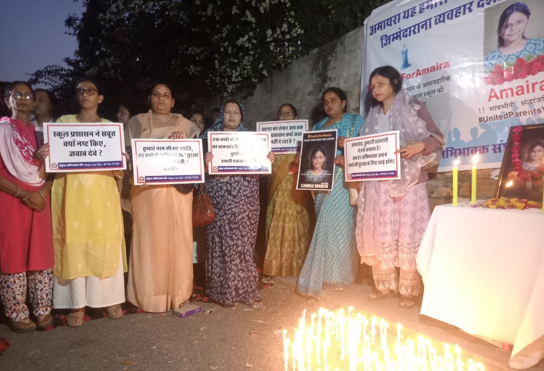 अभिभावकों ने अमायरा के चित्र के समक्ष मोमबत्तियाँ जलाकर मौन रखा।