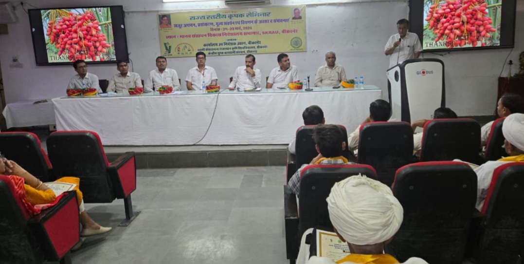 बीकानेर,उद्यान विभाग द्वारा राष्ट्रीय बागवानी मिशन योजनान्तर्गत स्वामी केशवानंद राजस्थान कृषि विश्वविद्यालय के मानव संसाधन विकास निदेशालय सभागार में खजूर उत्पादन, प्रसंस्करण, मूल्य संवर्धन व विपणन के अवसर एवं संभावनाएं विषय पर दो दिवसीय राज्य स्तरीय सेमिनार सफलतापूर्वक सम्पन्न हुआ। यह सेमिनार उद्यान विभाग, स्वामी केशवानंद राजस्थान कृषि विश्वविद्यालय तथा केंद्रीय शुष्क बागवानी संस्थान के संयुक्त तत्वावधान में आयोजित किया गया।