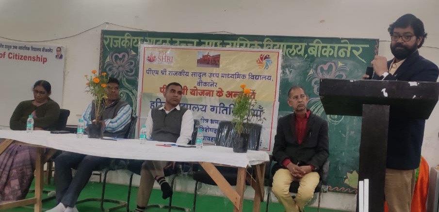 बीकानेर,पीएम श्री गतिविधि में हरित विद्यालय के अंतर्गत विशेषज्ञ वार्ता का आयोजन आज पीएम श्री राजकीय सादुल उच्च माध्यमिक विद्यालय, बीकानेर में हरित विद्यालय गतिविधि के अंतर्गत विशेषज्ञ वार्ता का आयोजन किया गया। कार्यक्रम के मुख्य वक्ता महाराजा गंगा सिंह विश्वविद्यालय, बीकानेर के असोसिएट प्रोफेसर अनिल कुमार छंगाणी और मुख्य अतिथि पर्यावरणविद अंगद बिश्नोई थे।