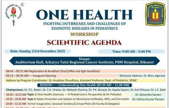 बीकानेर, सरदार पटेल मेडिकल कॉलेज, बीकानेर के शिशु एवं बाल रोग विभाग, बीकानेर पीडिट्रिक्स सोसायटी तथा भारतीय बाल चिकित्सा, अकादमी के संयुक्त तत्वावधान में रविवार को आचार्य तुलसी रिसर्च एवं अनुसंधान केन्द्र के प्रेक्षागृह में बाल एवं शिशु रोग विशेषज्ञों की जूनोटिक रोग, कारण, प्रभाव व नियंत्रण’’ पर एक दिवसीय कार्यशाला सुबह साढ़े नौ बजे से शाम चार बजे तक होगी। कार्यशाला में बीकानेर जिले के करीब 70 बाल एवं शिशु रोग विशेषज्ञों को आमंत्रित किया गया है।