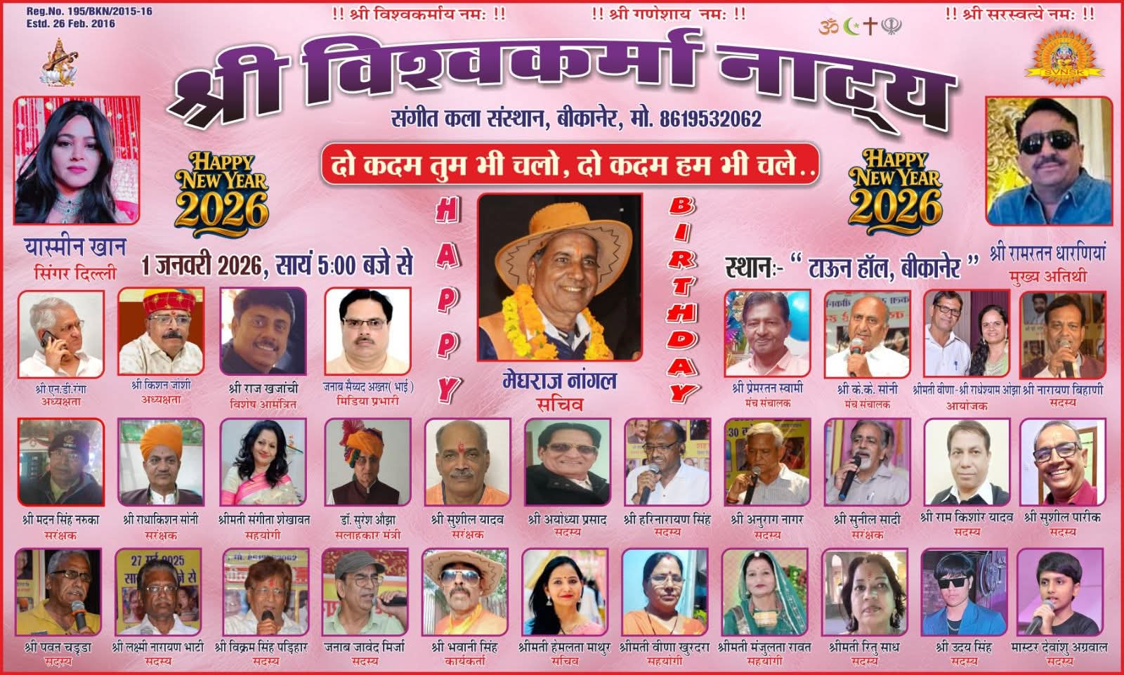 बीकानेर, विश्वकर्मा नाट्य संगीत कला संस्थान, बीकानेर द्वारा नये साल 2026 के अवसर पर पहले दिन 1 जनवरी गुरुवार की संध्या को स्थानीय टाउन हॉल में सदाबहार फिल्मी गीतों पर आधारित “दो कदम तुम भी चलो, दो कदम हम भी चले”…. गीत संगीत कार्यक्रम रखा गया है।
